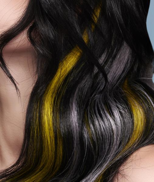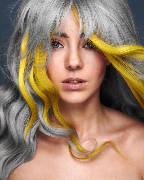 Kolekcja jest też przykładem kontrastu symultanicznego. Zastanówcie się, jak odbieracie te same CZYSTE kolory kiedy znajdują się w otoczeniu innych barw. Żółte pasma w towarzystwie bardzo ciemnego brązu (czerni europejskiej) sprawiają wrażenie jaśniejszych i bardziej świecących, natomiast w zestawieniu z szarym, który stanowi jaśniejsze tło, wydają się ciemniejsze i bardziej zgaszone. Z kolei szare pasma na tle czarnej masy włosów wyglądają bardzo jasno, a w towarzystwie żółtego zdecydowanie ciemniej. (dop. red. SUZI, projektowanie fryzur, kontrasty, FRK.03)