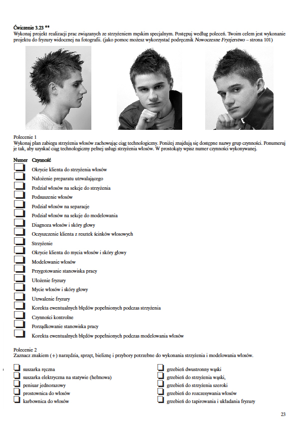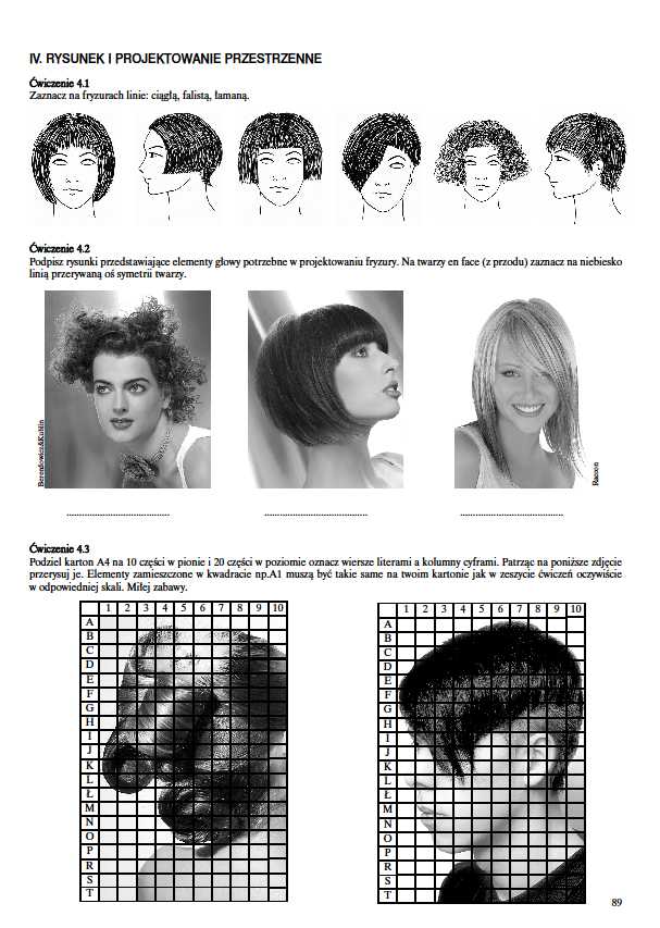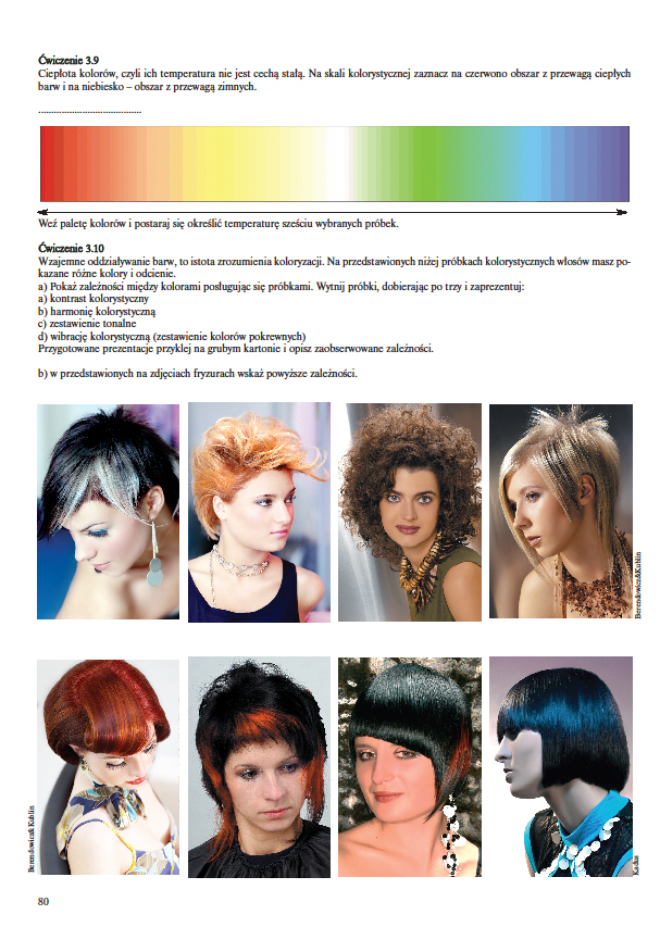 Ćwiczenia zawierają testy oraz aktywizujące ćwiczenia oraz zadania. Uczą rozwiązywania problemów, etapów zabiegów fryzjerskich, sprawdzają wiedzę z zakresu technik, technologii i stylizacji fryzjerskiej. Do nauki w szkole i samokształcenia. Na egzaminy z OKE i cechowe