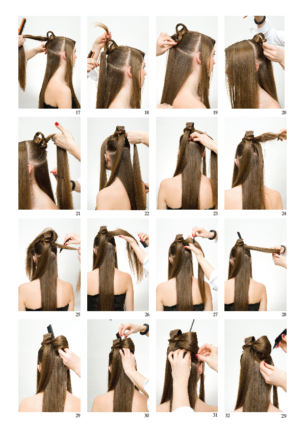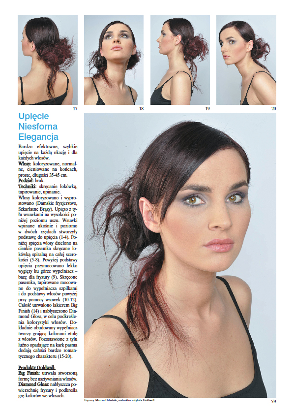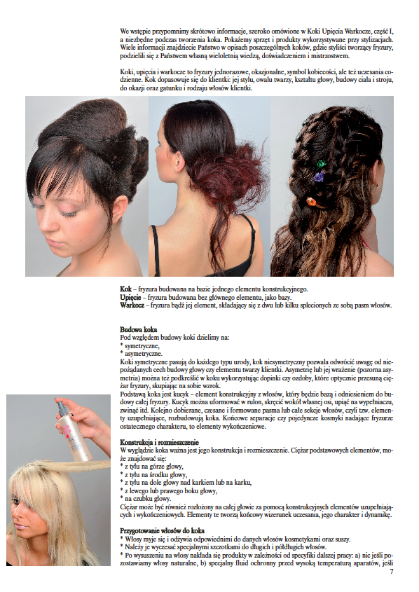 • fryzury krok-po-kroku (praca stylistów/ instruktorów, opisy wykonywania upięć i koków)