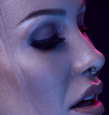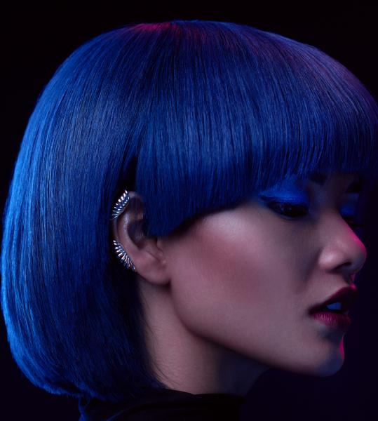 Modelka o długich włosach w kolorze chłodnego truskawkowego blondu – w wersji glamour, ma włosy mocno wystylizowane w duże wygładzone pukle. Przydymiony makijaż podkreśla dodatkowo dramatyczny efekt. W kolejnej odsłonie ma upięte na karku luźno skręcone pasma wymykające się na ramiona z masy włosów podniesionych na górze głowy i wygładzonych na bokach – dynamiczna i dominująca. Trzecia wizja w cyberprzestrzeni, to mięsiste warkocze uplecione od karku do czoła w formę irokeza, z bokami przysłoniętymi przez delikatne kosmyki. Druga modelka ma orientalną urodę, włosy w kolorze granatowej czerni i makijaż na lata 70’. Jej fryzury, to wysoki koński ogon na szczycie głowy ze spływającą na plecy kaskadą wyrazistych loków albo roztrzepane i wijące się wokół twarzy nieregularne loczki przypominające unowocześnioną “mokrą włoszkę”. Kolejna wersja to stylizowany niebieski bob z mocno wyciętą, głęboką wklęsłą grzywką o nieregularnej krawędzi.