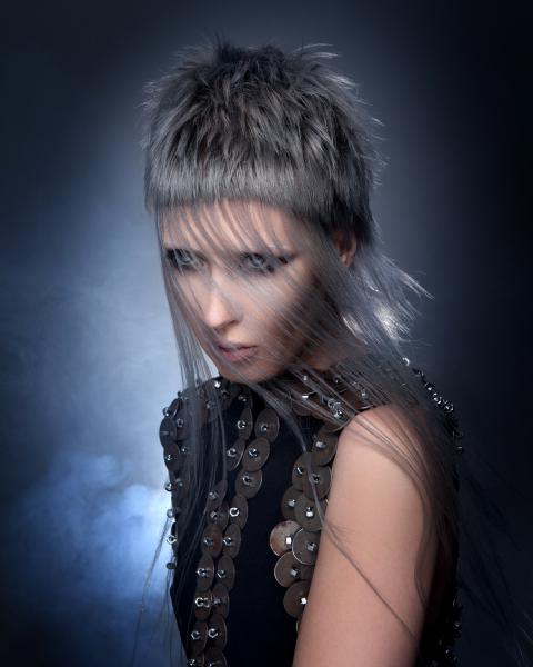 Dla mnie kolekcja Daughters of the Cosmos kojarzy się z fabularną grą na PlayStation – Bloodborne, opracowaną przez japońskie studio, w reżyserii Hidetaka Miyazaki (z niesamowitą muzyką). Akcja rozgrywa się w posępnym świecie wiktoriańskiego fantasy, w podziemnym mieście pełnym mrocznych tajemnic, niepokojących postaci i potworów narodzonych ze starej krwi oraz rycerzy walczących ze złem. Główny bohater nosi na głowie rycerski hełm z przyłbicą i skrzydełkami po bokach uniesionymi w tył i w górę. Niektórzy wojownicy zasłaniają twarze powiewającymi z boków materiami przypominającymi woale. Tytułowa postać przybyła z mroku dziejów - Córka Kosmosu, przecina przestrzeń cienkimi mackami. Górna część jej ciała ma puste poprzeczne równoległe przestrzenie. Stroje modelek kolekcji Brandona Messingera przywodzą na myśl zbroje, rycerskie kolczugi chroniące przed ciosami mieczy, a fryzury nawiązują do stylistyki gry – zwizualizowanych kształtów, tekstur, kompozycji i kolorów. Bojowe, futurystyczne, mroczne, odważne – kobiety przyszłości. (dop. Red. Zuzanna Sumirska, wyd. SUZI, abcfryzjera.pl)