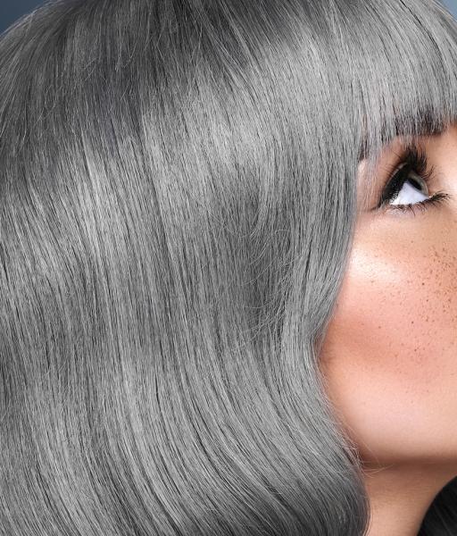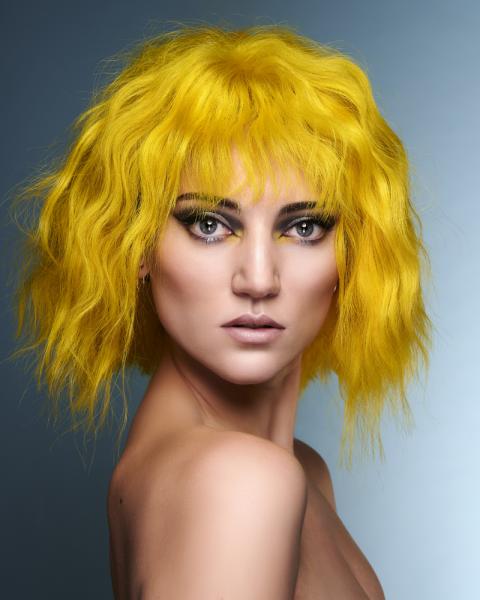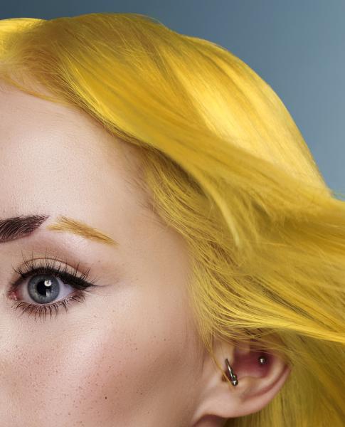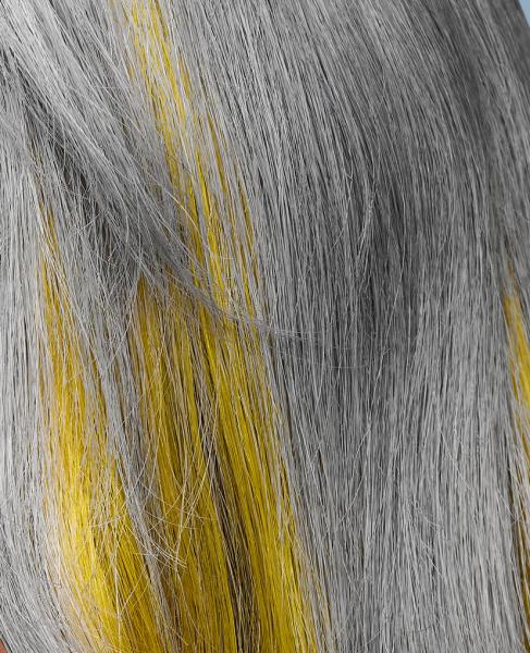 Kolekcja jest też przykładem kontrastu symultanicznego. Zastanówcie się, jak odbieracie te same CZYSTE kolory kiedy znajdują się w otoczeniu innych barw. Żółte pasma w towarzystwie bardzo ciemnego brązu (czerni europejskiej) sprawiają wrażenie jaśniejszych i bardziej świecących, natomiast w zestawieniu z szarym, który stanowi jaśniejsze tło, wydają się ciemniejsze i bardziej zgaszone. Z kolei szare pasma na tle czarnej masy włosów wyglądają bardzo jasno, a w towarzystwie żółtego zdecydowanie ciemniej. (dop. red. SUZI, projektowanie fryzur, kontrasty, FRK.03)