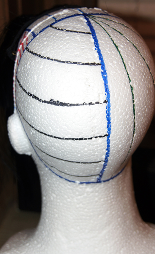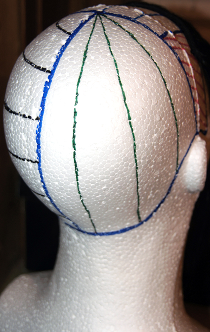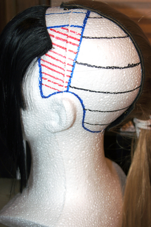 Pasma przypinaj do głowy styropianowej szpilkami/ kokówkami.