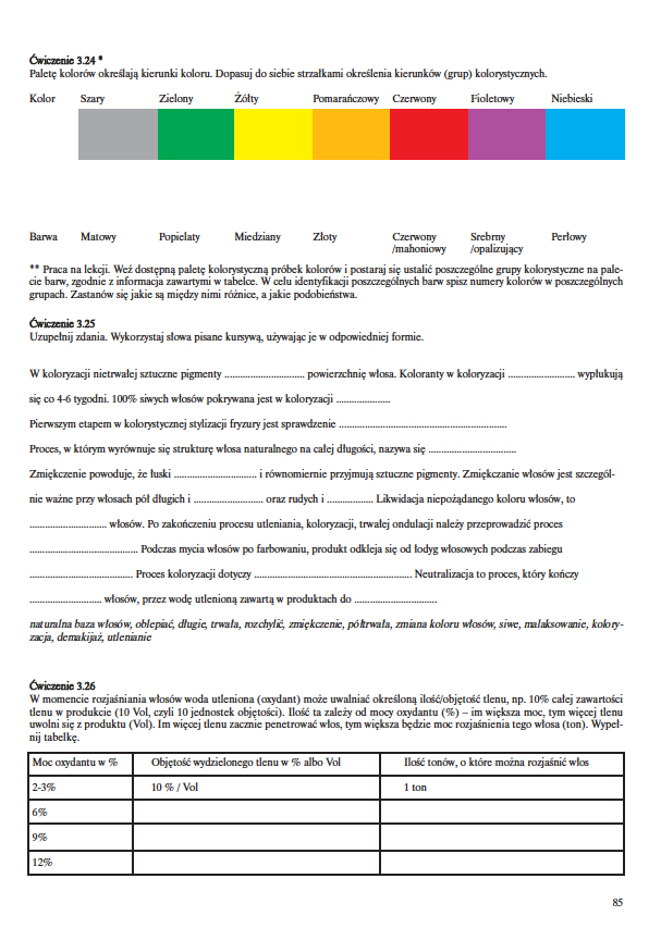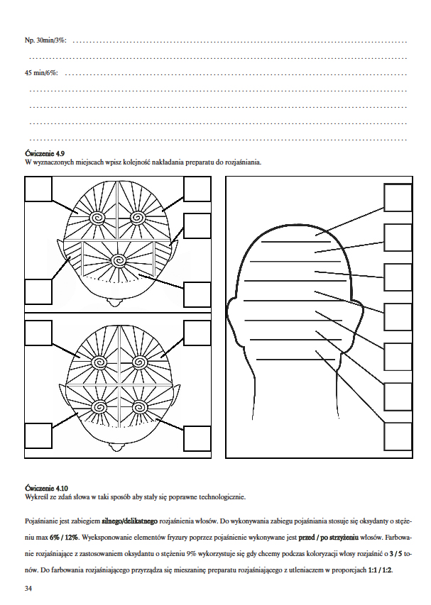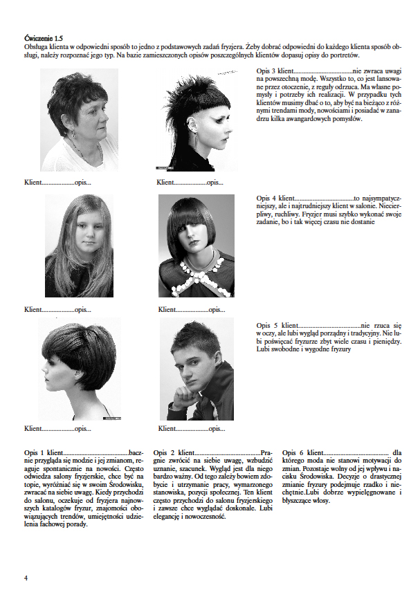 Ćwiczenia zawierają testy oraz aktywizujące ćwiczenia oraz zadania. Uczą rozwiązywania problemów, etapów zabiegów fryzjerskich, sprawdzają wiedzę z zakresu technik, technologii i stylizacji fryzjerskiej. Do nauki w szkole i samokształcenia. Na egzaminy z OKE i cechowe