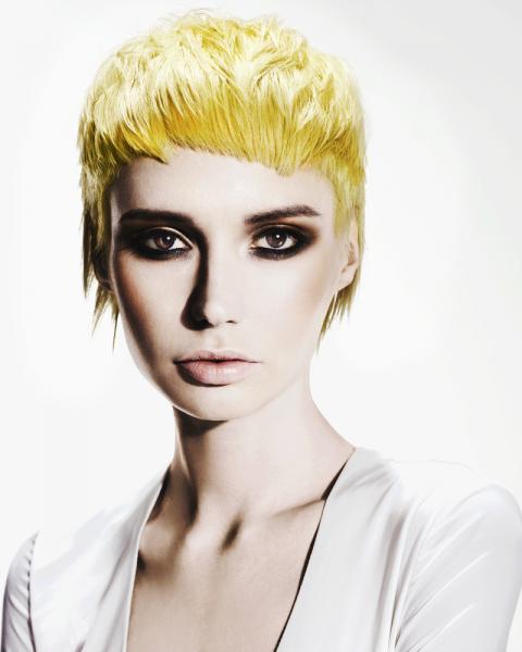 S. Burton, Safy B's, Aylesbury, fot. D. Greensmith, SUZI, FRK.03, kontrast symultaniczny, żółty, projektowanie fryzur