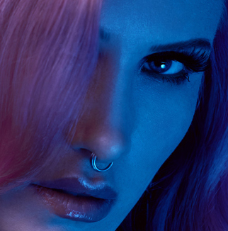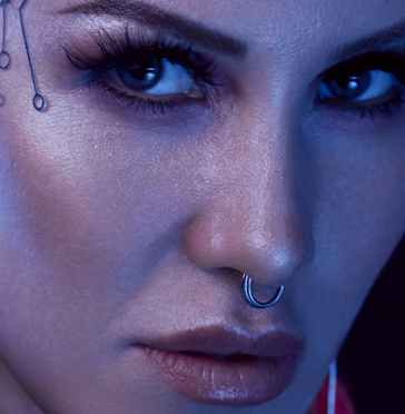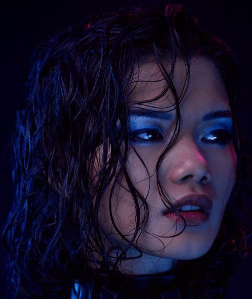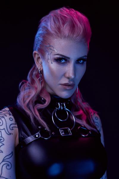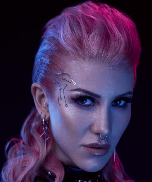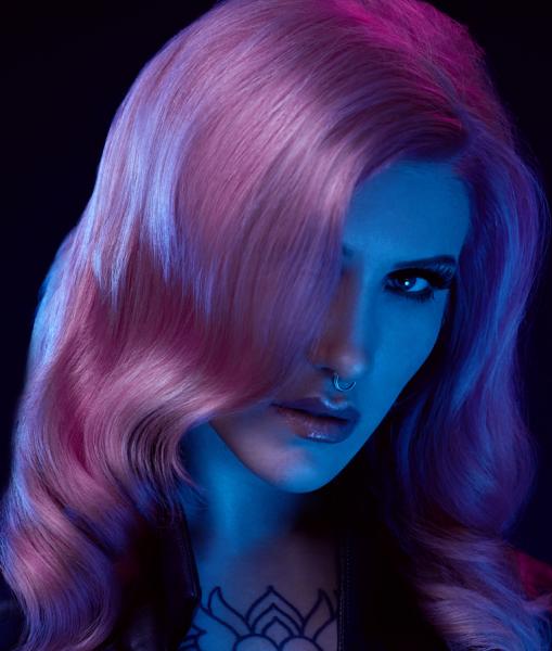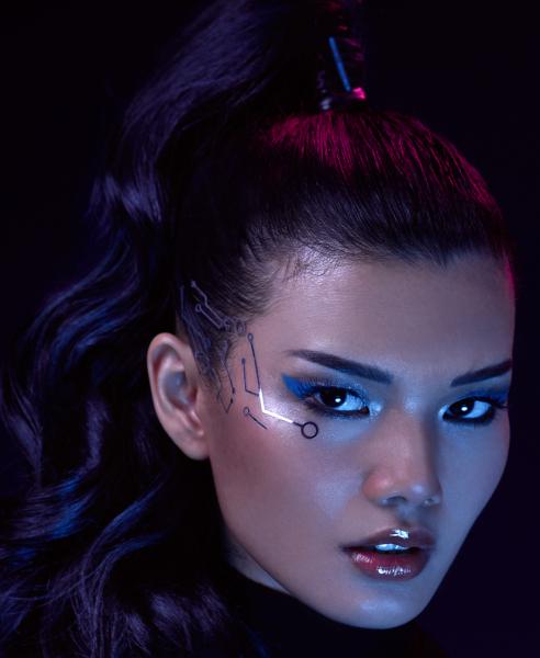 Modelka o długich włosach w kolorze chłodnego truskawkowego blondu – w wersji glamour, ma włosy mocno wystylizowane w duże wygładzone pukle. Przydymiony makijaż podkreśla dodatkowo dramatyczny efekt. W kolejnej odsłonie ma upięte na karku luźno skręcone pasma wymykające się na ramiona z masy włosów podniesionych na górze głowy i wygładzonych na bokach – dynamiczna i dominująca. Trzecia wizja w cyberprzestrzeni, to mięsiste warkocze uplecione od karku do czoła w formę irokeza, z bokami przysłoniętymi przez delikatne kosmyki. Druga modelka ma orientalną urodę, włosy w kolorze granatowej czerni i makijaż na lata 70’. Jej fryzury, to wysoki koński ogon na szczycie głowy ze spływającą na plecy kaskadą wyrazistych loków albo roztrzepane i wijące się wokół twarzy nieregularne loczki przypominające unowocześnioną “mokrą włoszkę”. Kolejna wersja to stylizowany niebieski bob z mocno wyciętą, głęboką wklęsłą grzywką o nieregularnej krawędzi.