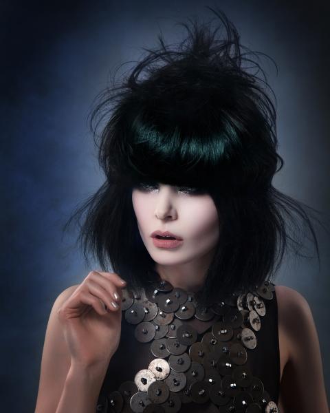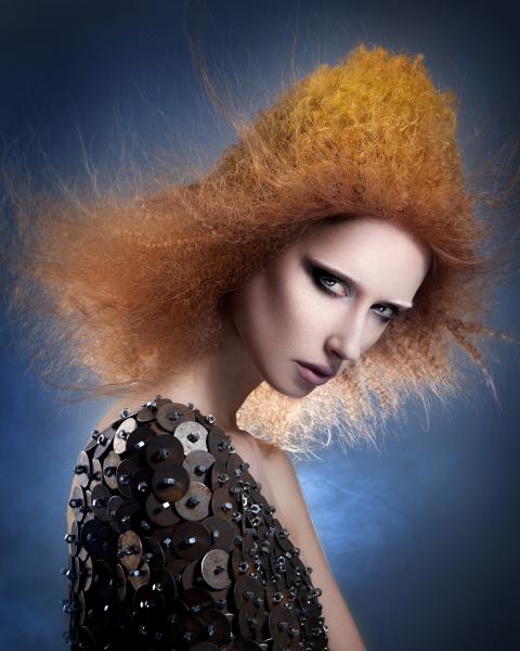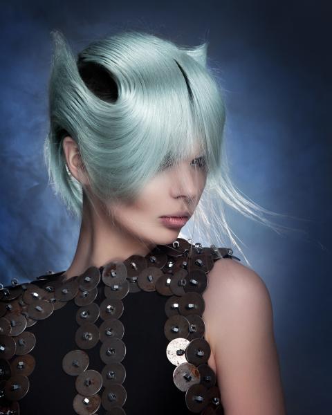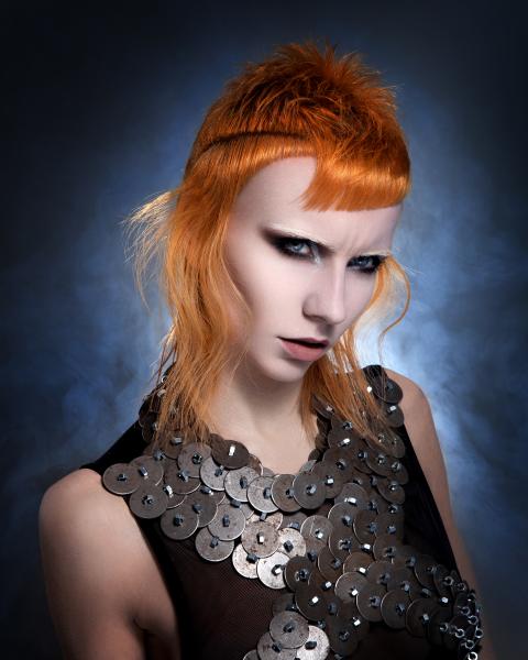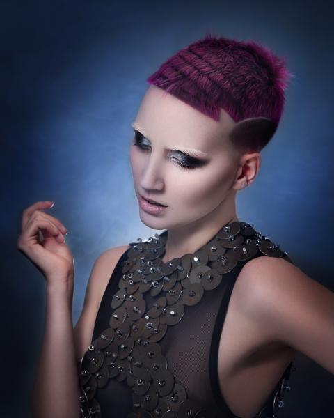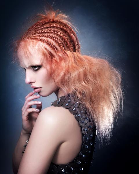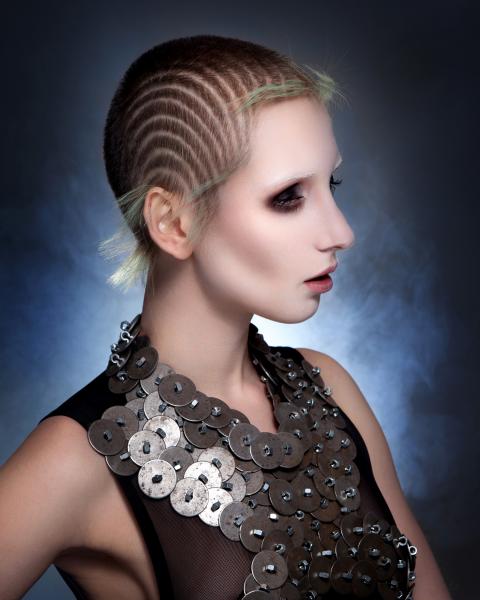 Dla mnie kolekcja Daughters of the Cosmos kojarzy się z fabularną grą na PlayStation – Bloodborne, opracowaną przez japońskie studio, w reżyserii Hidetaka Miyazaki (z niesamowitą muzyką). Akcja rozgrywa się w posępnym świecie wiktoriańskiego fantasy, w podziemnym mieście pełnym mrocznych tajemnic, niepokojących postaci i potworów narodzonych ze starej krwi oraz rycerzy walczących ze złem. Główny bohater nosi na głowie rycerski hełm z przyłbicą i skrzydełkami po bokach uniesionymi w tył i w górę. Niektórzy wojownicy zasłaniają twarze powiewającymi z boków materiami przypominającymi woale. Tytułowa postać przybyła z mroku dziejów - Córka Kosmosu, przecina przestrzeń cienkimi mackami. Górna część jej ciała ma puste poprzeczne równoległe przestrzenie. Stroje modelek kolekcji Brandona Messingera przywodzą na myśl zbroje, rycerskie kolczugi chroniące przed ciosami mieczy, a fryzury nawiązują do stylistyki gry – zwizualizowanych kształtów, tekstur, kompozycji i kolorów. Bojowe, futurystyczne, mroczne, odważne – kobiety przyszłości. (dop. Red. Zuzanna Sumirska, wyd. SUZI, abcfryzjera.pl)