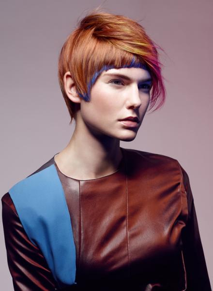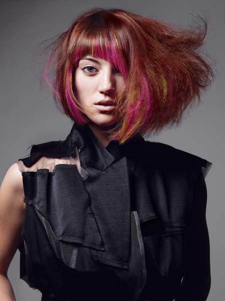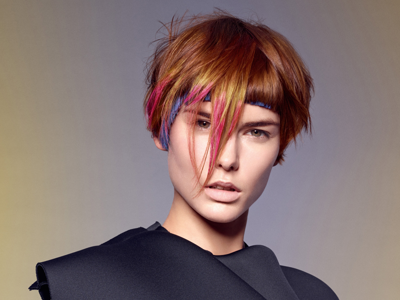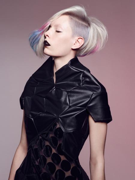 Dwa pozornie osobne kształty perfekcyjnie łączą się w jedną oszałamiającą stylizację. Wewnętrzne warstwy tworzą unikalny kształt, a wycięta grzywka dodaje fryzurze charakteru. Zakłócony bob jest perfekcyjnie podkreślony przez delikatne muśnięcie jaskrawego zielonego i żółtego koloru przepływające po zewnętrznej warstwie włosów.