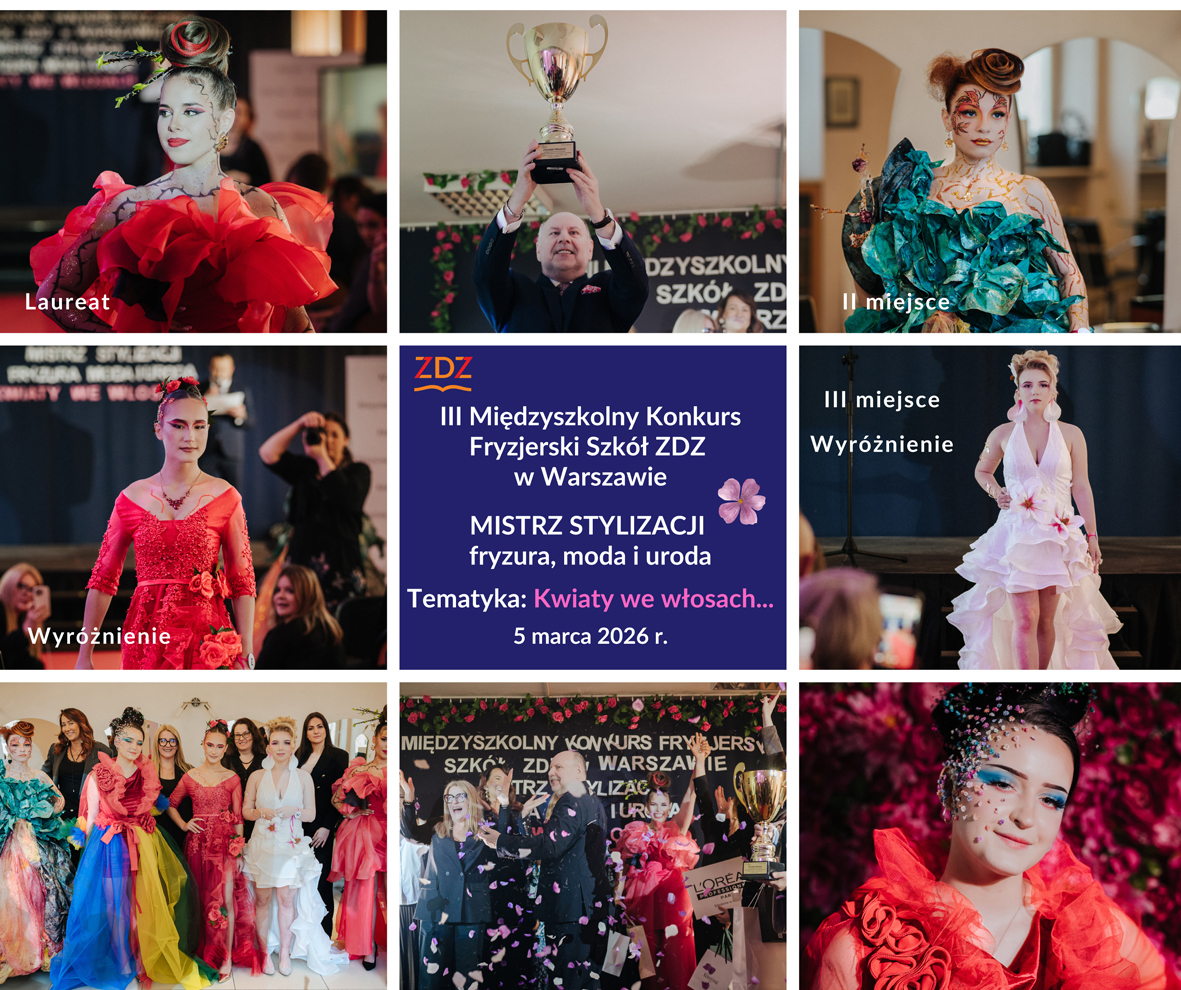 5 marca br. odbył się III Międzyszkolny Konkurs Fryzjerski Szkół ZDZ w Warszawie. MISTRZ STYLIZACJI – fryzura, moda i uroda. W konkursie brali udział uczniowie z pięciu szkół, którzy kształcą się w zawodzie fryzjer i technik usług fryzjerskich. W tym roku zgodnie z tematyką konkursu było pięknie i kolorowo , a stylizacje były kreatywne i zainspirowane kwiatami.