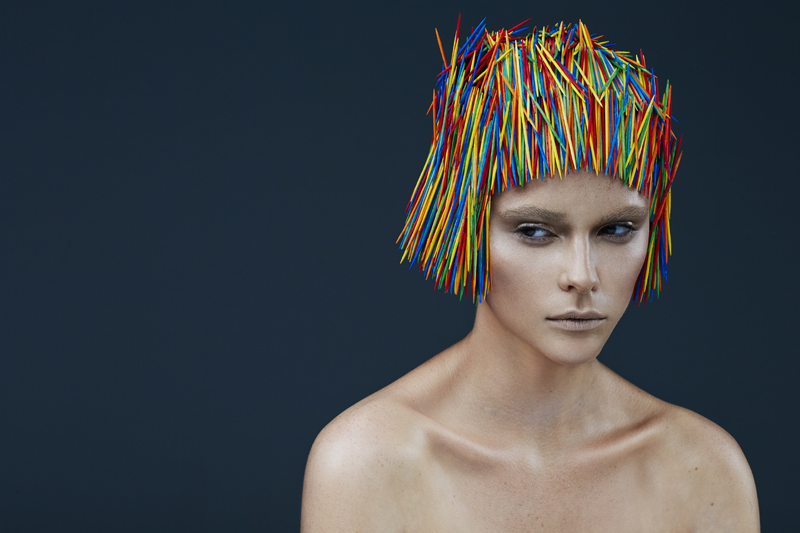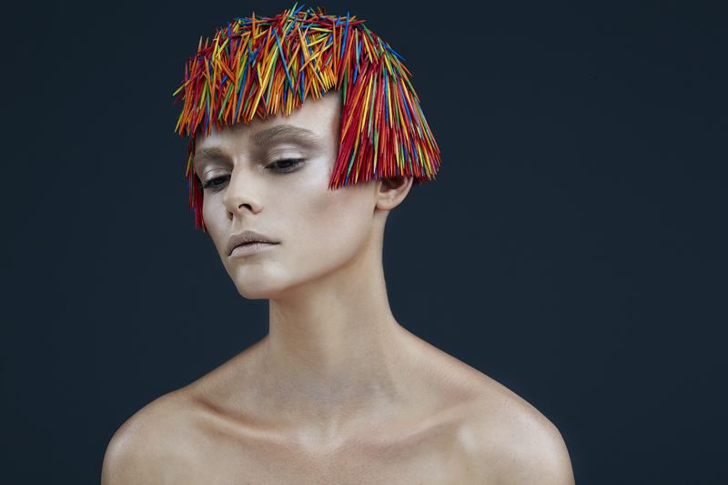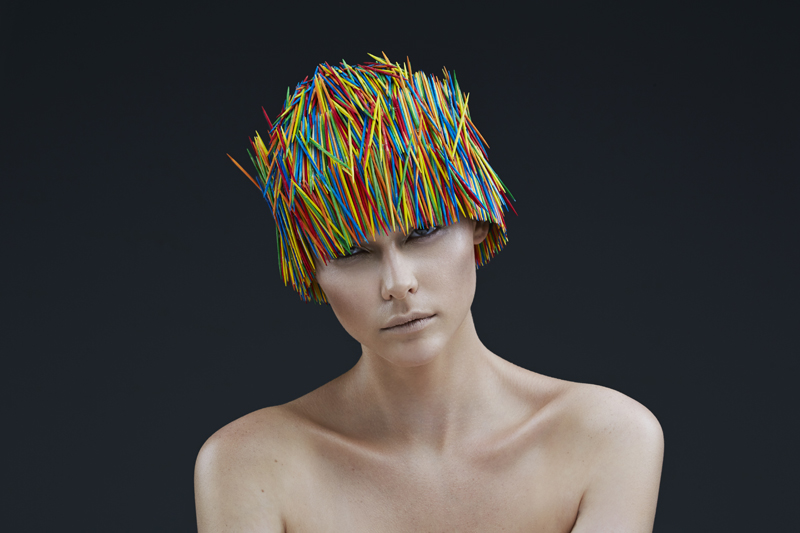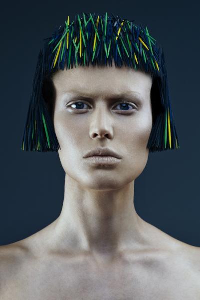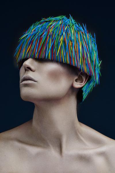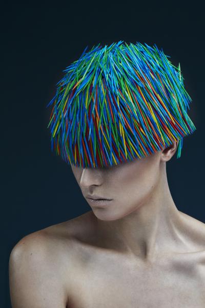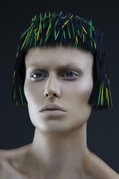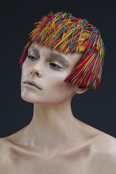 Inspirowane strzyżeniem w stylu angielskim – tradycyjnym, mocnym i graficznym. Te niezwykłe „fryzury” łączą strukturę i teksturę, bez użycia włosów. Zamiast włosów są wykałaczki. Mają one regularny, silny i "smukły" kształt podobny do włosa. (Wykałaczki umożliwiają graficzne i trójwymiarowe pokazanie formy fryzury, efektu strzyżenia, kierunku i koncepcji ułożenia włosów - to projektowanie konturu zewnętrznego, wewnętrznego i struktury w masie włosów dzięki przerysowanym efektom uzyskanym różnymi technikami strzyżenia – dopisek od redakcji)
