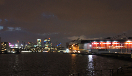ExCel London w dokach londyńskich, które każdego dnia biorą udział w pracy przemysłowych gigantów, patrzy na transporty, przeładunki, dźwigi – monumentalne w dzień, magiczne nocą.