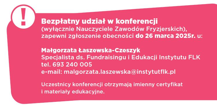 Dostęp do targów fryzjerskich LOOK i do konferencji jest bezpłatny dla nauczycieli zawodów fryzjerskich, którzy zapiszą się na konferencję. Dlatego prosimy osoby zainteresowane udziałem w konferencji, żeby zgłaszały swoją obecność do Małgorzaty Łaszewskiej-Czeszyk (kontakt poniżej) najpóźniej do 26 marca 2025 roku. Na zakończenie uczestnicy otrzymają imienny certyfikat oraz materiały edukacyjne, co dodatkowo podkreśla wartość i profesjonalizm tego wydarzenia.